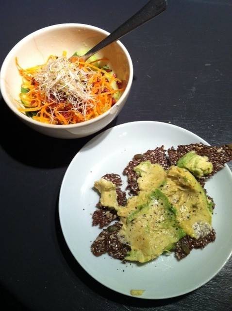 Salad with cucumber, mint, carrots and sprouts, and a linseed cracker with avo. Not horrible, as lunches go.