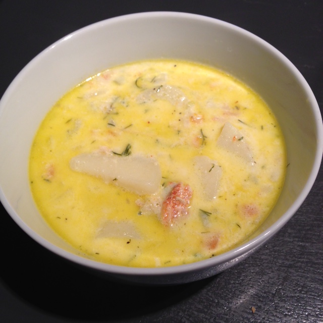 In a frying pan, cover the fish with the milk and two bay leaves and let it simmer gently for 10 minutes. In a large saucepan, sauté your onion in butter. Add your carrots, celery, potatoes and ‘leeks’ and schmoonk them around till they’re covered in butter. You might want to add more butter. Remove the fish from the milk and put the fish aside. Add the fishy milk to your saucepan together with a handful of dill and a splash of fish stock. Let it simmer until your potatoes are cooked. While they are cooking break the fish up into bite-sized pieces and remove any skin or bones. Let the soup thicken. Add a drizzle of cream and the fish. Let the flavours make friends for a few minutes and then add salt and pepper to taste. Serve very hot with bread and if you’re impressing people, parsley.
